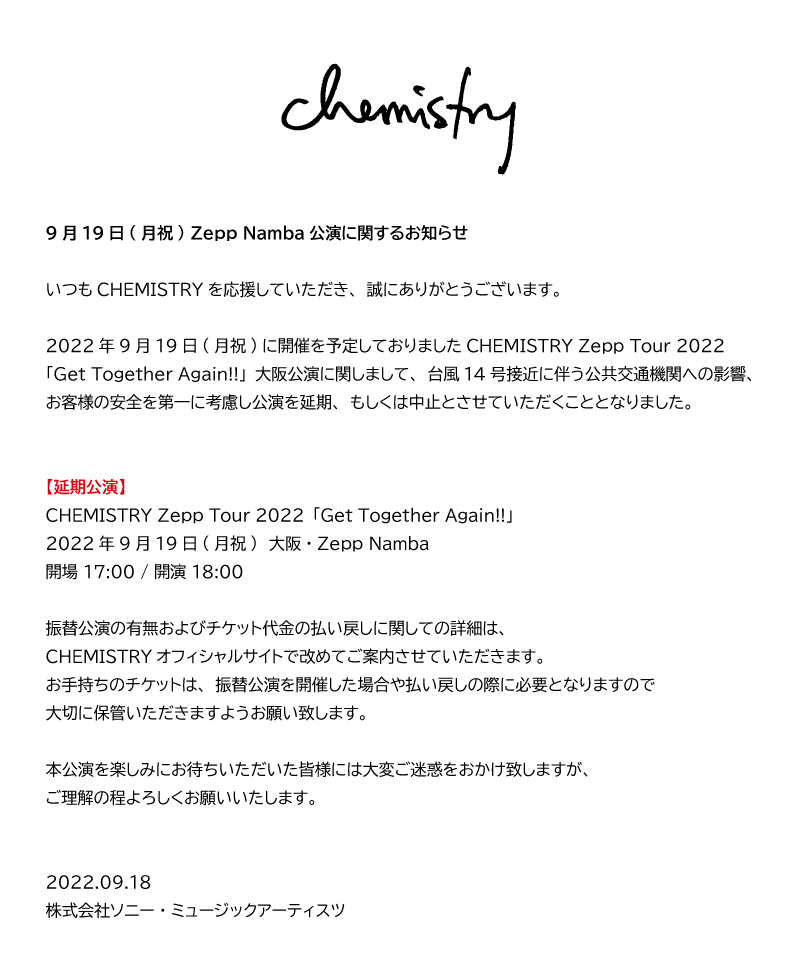 【9月 19 日(月祝)Zepp Namba 公演に関するお知らせ】