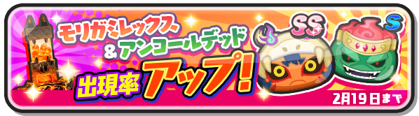【2/19(月)まで】おはじきガシャから、SSランクの「モリガミレックス」とSランクの「アンコールデッド」の出現率がアップ中!どちらもおはじきバトルで、ダメージアップの特殊能力を持っているよ。#ぷにぷに