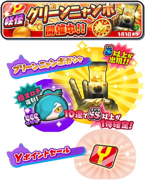 【グリーンニャンボ】3/3(土)まで「妖怪グリーンニャンボ」開催中!グリーンニャンボガシャにSSSランク「極オロチ」が復刻しているよ!ミッションや購入から「ニャンボコイン」を入手してチャレンジしてね!さらにYポイントセールも♪ #ぷにぷに