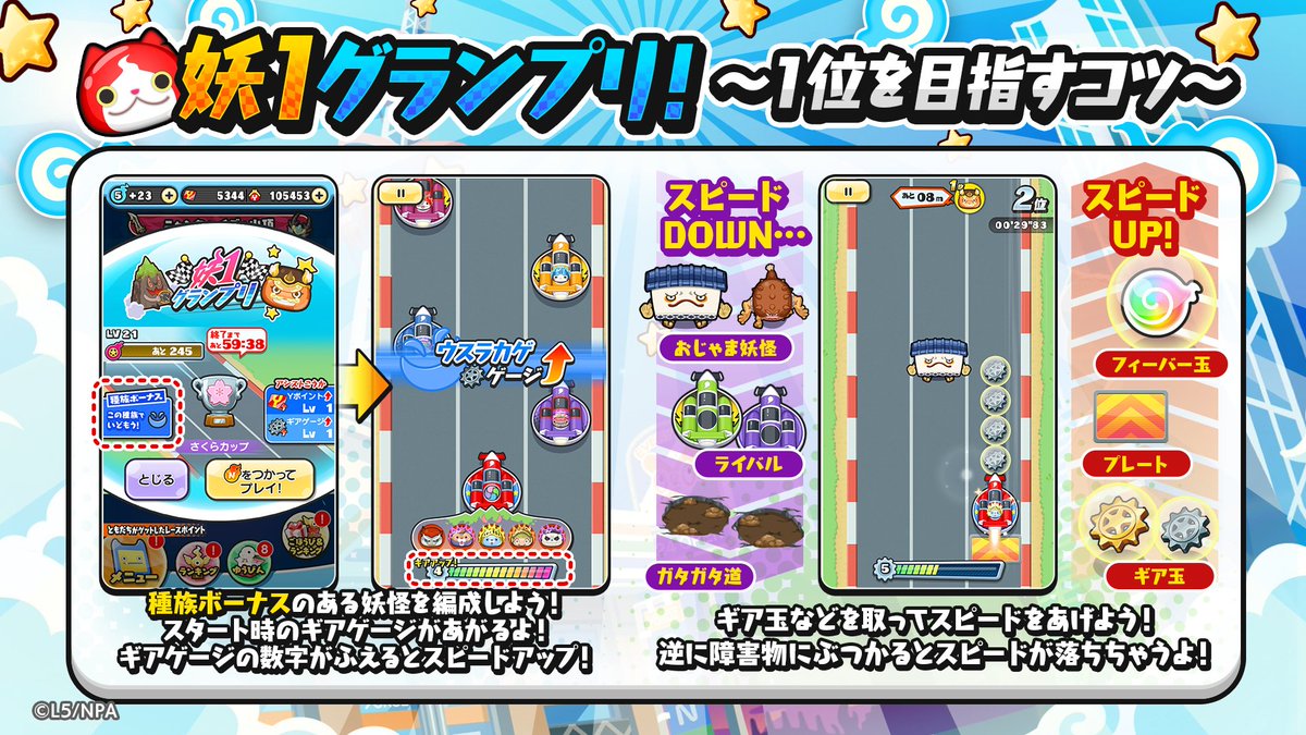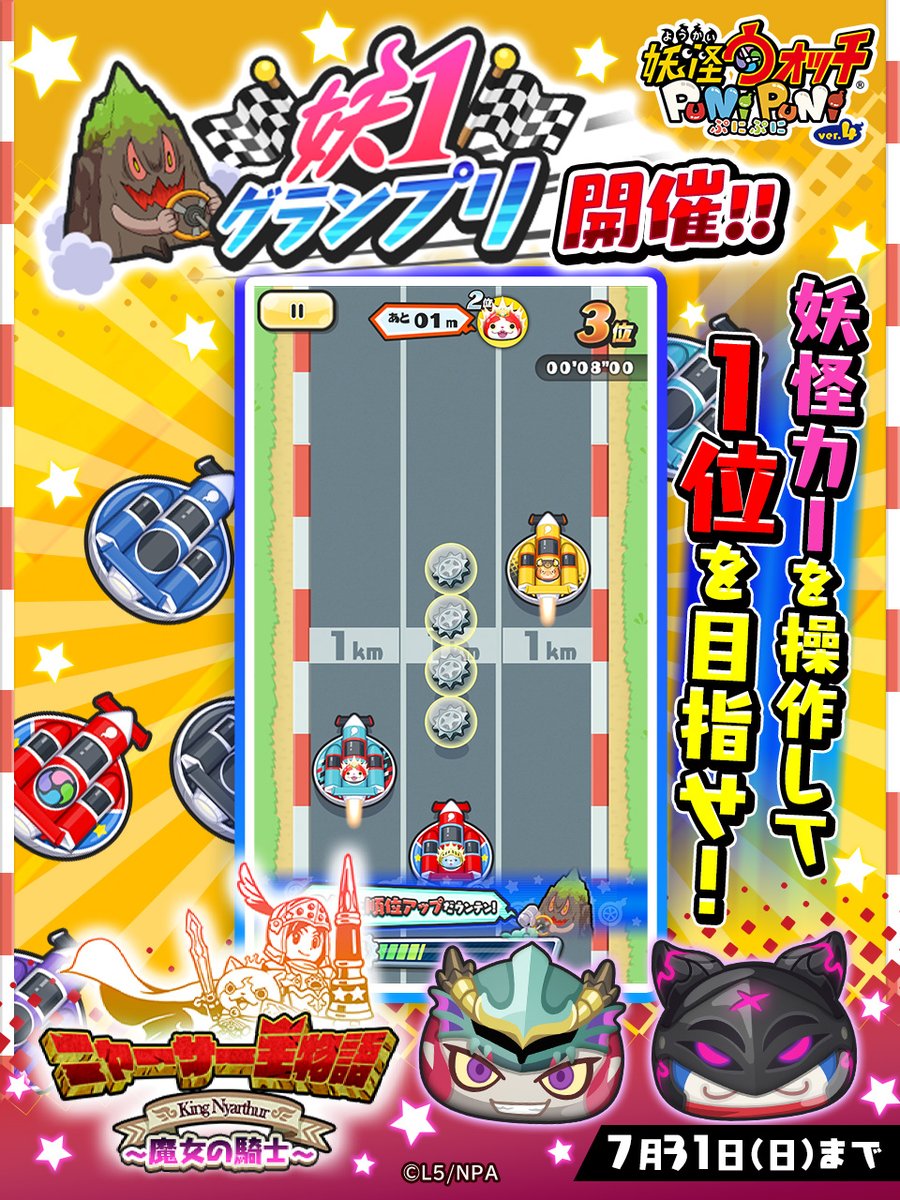 7/31(日)まで「ニャーサー王物語~魔女の騎士~」を開催!新たなイベントタイプ「妖1グランプリ」が登場!カーレースでライバルたちを追い抜いて、1位を目指そう!詳細はゲーム内をチェックしてね!#ぷにぷに