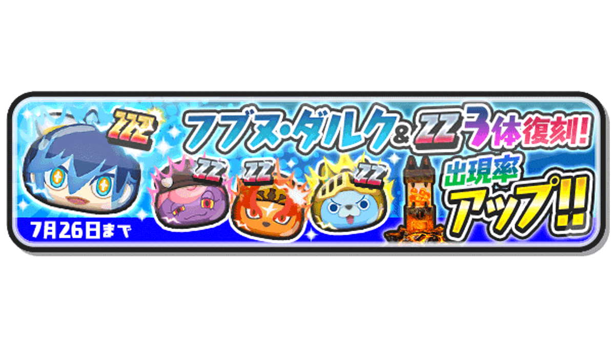 7/29(金)まで、ZZZランク「ナンダリュウフリート」やZZランク「ブリュンえんら」「コマスタン」「ゼロ・ファウスト」の出現率がアップ中!まだ仲間にできていない人は、ぜひこのチャンスに仲間にしよう! #ぷにぷに