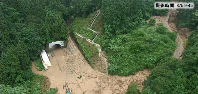 下り線(金沢方面)においても復旧作業を行っておりますが災害規模が大きいため(大型トラック約4,000台分の土砂流入)、8月末頃の解除を見込んでおります。