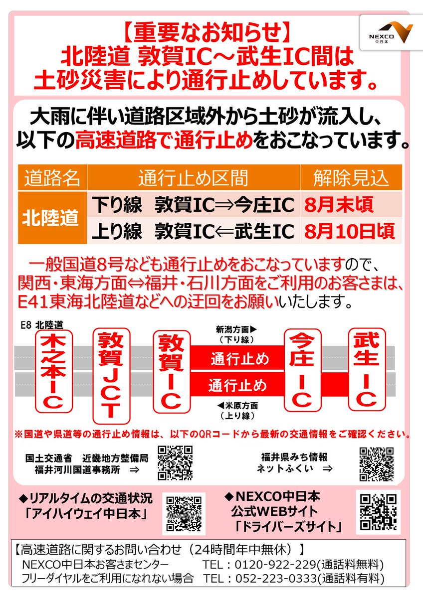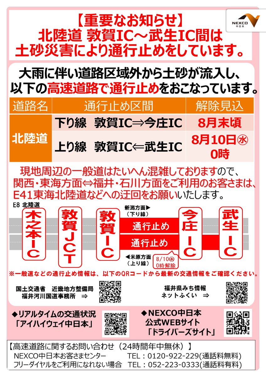 #北陸道 下り線 敦賀IC~今庄IC間の大雨に伴う土砂災害による通行止めの解除見込みをお知らせします。