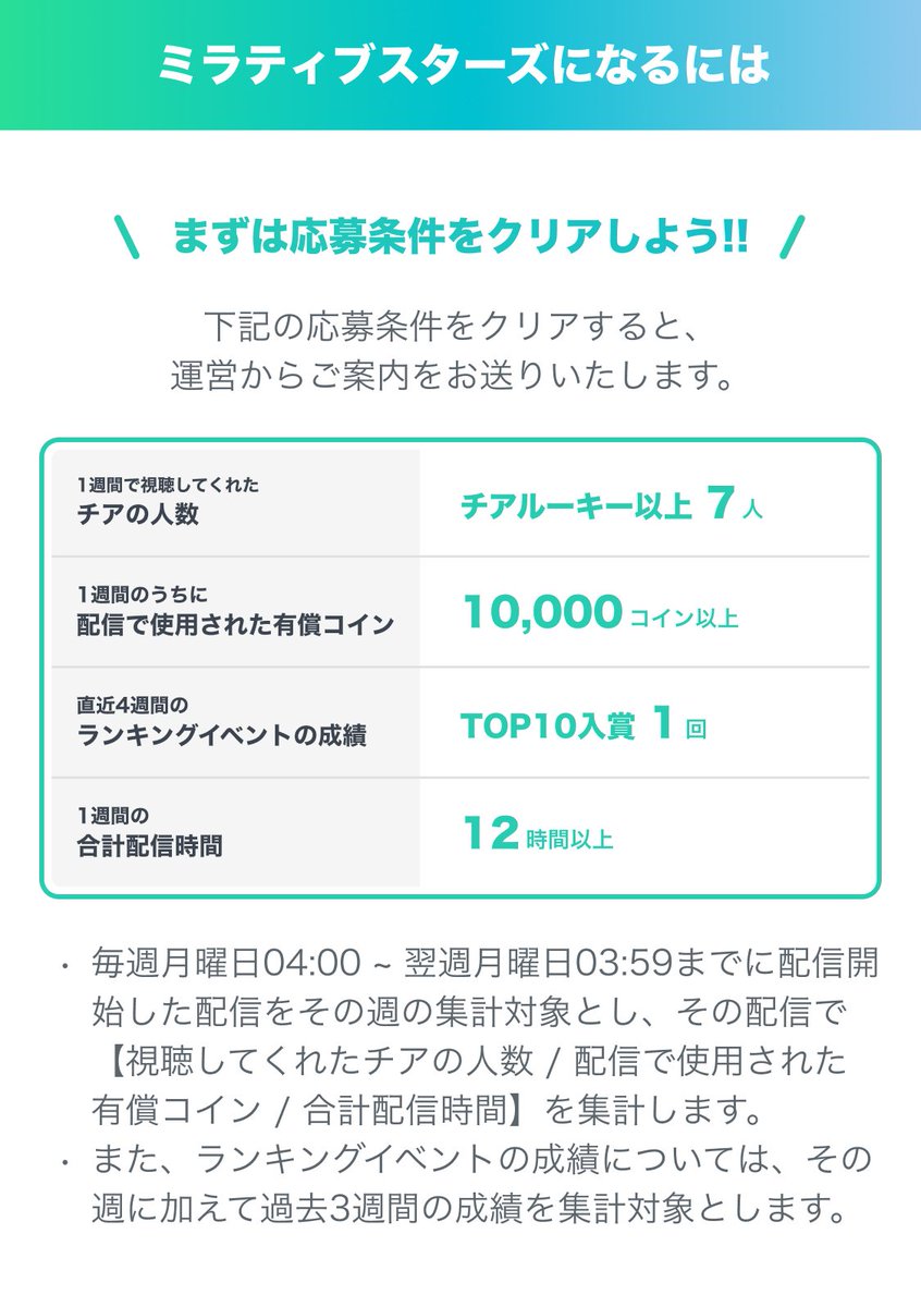 ミラティブスターズは「配信で生活したい・副収入がほしい気持ちを応援する」制度です。