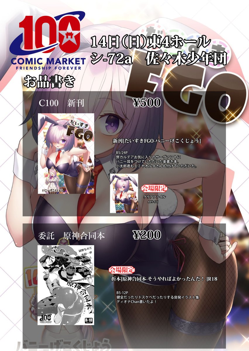 C100佐々木少年団の新刊「だいすきFGO バニーげこくじょう」は書店様にて予約開始しました。ご縁がありましたらばよしなに。 #コミケ100 #C100