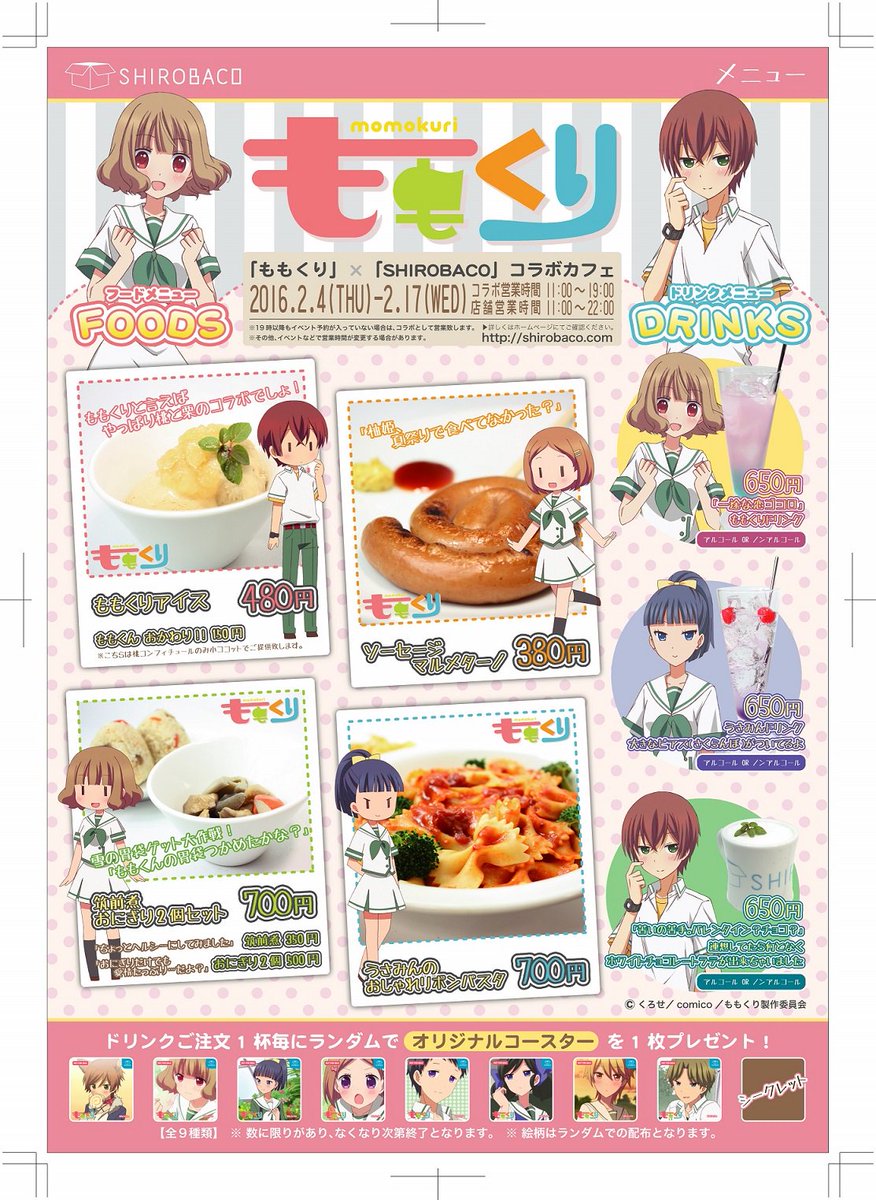 2/4(木)~2/17(水)の2週間限定で「ももくり×SHIROBACO」が開催中です!特別にメニュー表を公開☆オリジナルフード&ドリンクメニューを多数ご用意してますよ!!