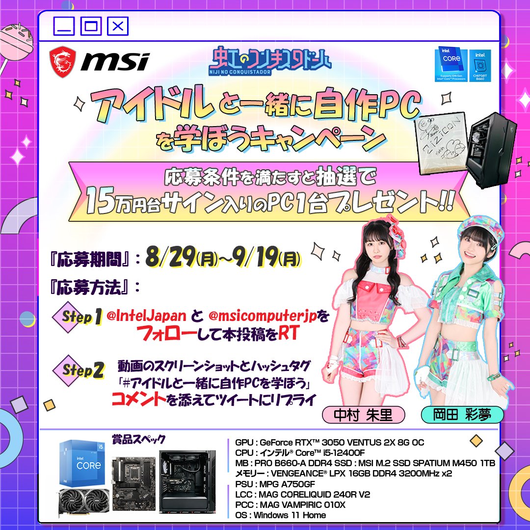 ②本ツイートをRTし、配信内MSI or Intel製品の画像と #清水教室自作PC教室 をつけ