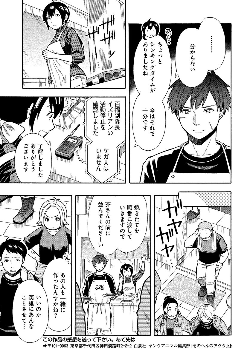 こんな感じで続いていくポストアポカリプスゆるゆる日常コメディ「そのへんのアクタ」はヤングアニマルZEROで連載中で、現在1巻が発売中です。宜しくお願いします。