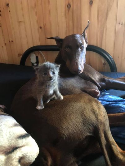 飼っていたドーベルマンが子犬を出産。その一週間後にガレージの裏で子ネコを発見。母親に見放されたらしく、帰宅してドーベルマンにお世話をお願いしたところ匂いを嗅いで受け入れてくれたそう。