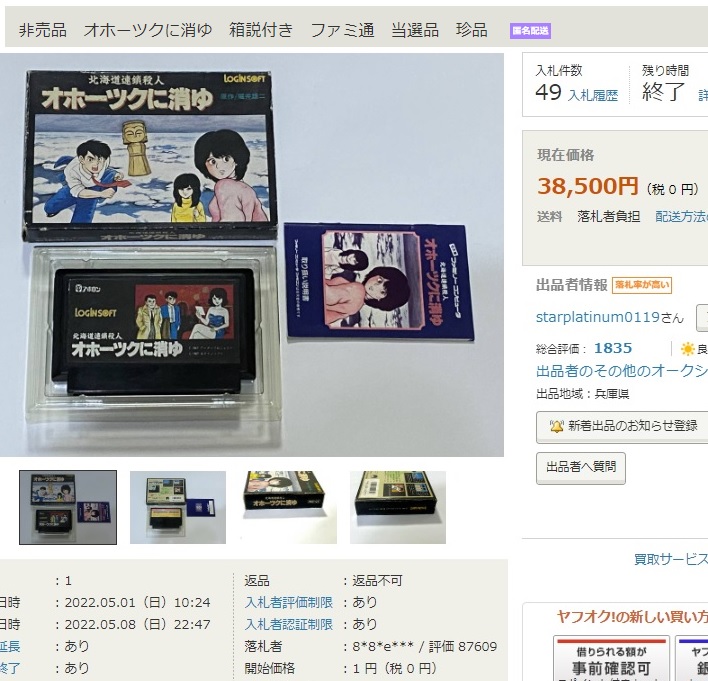 高額に終わった『オホーツクに消ゆ』別ラベル版のヤフオクについて検証したら偽物の存在や、ファミコン通信の付録「禁断の秘技」シールが貼られたカセットを当選品と偽る出品例に辿りつきました。皆さん、入札には十分気をつけて下さい。詳しくはこちら↓