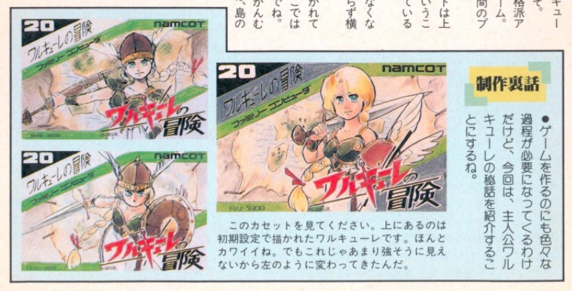 NG1986年7月号にファミコン版『ワルキューレの冒険』のパッケージ初期案が載っていました。兜を脱いだワル様もステキです。左下が実際に選ばれたデザインのようですね。番号が20番なのが気になります。(製品版は17番)