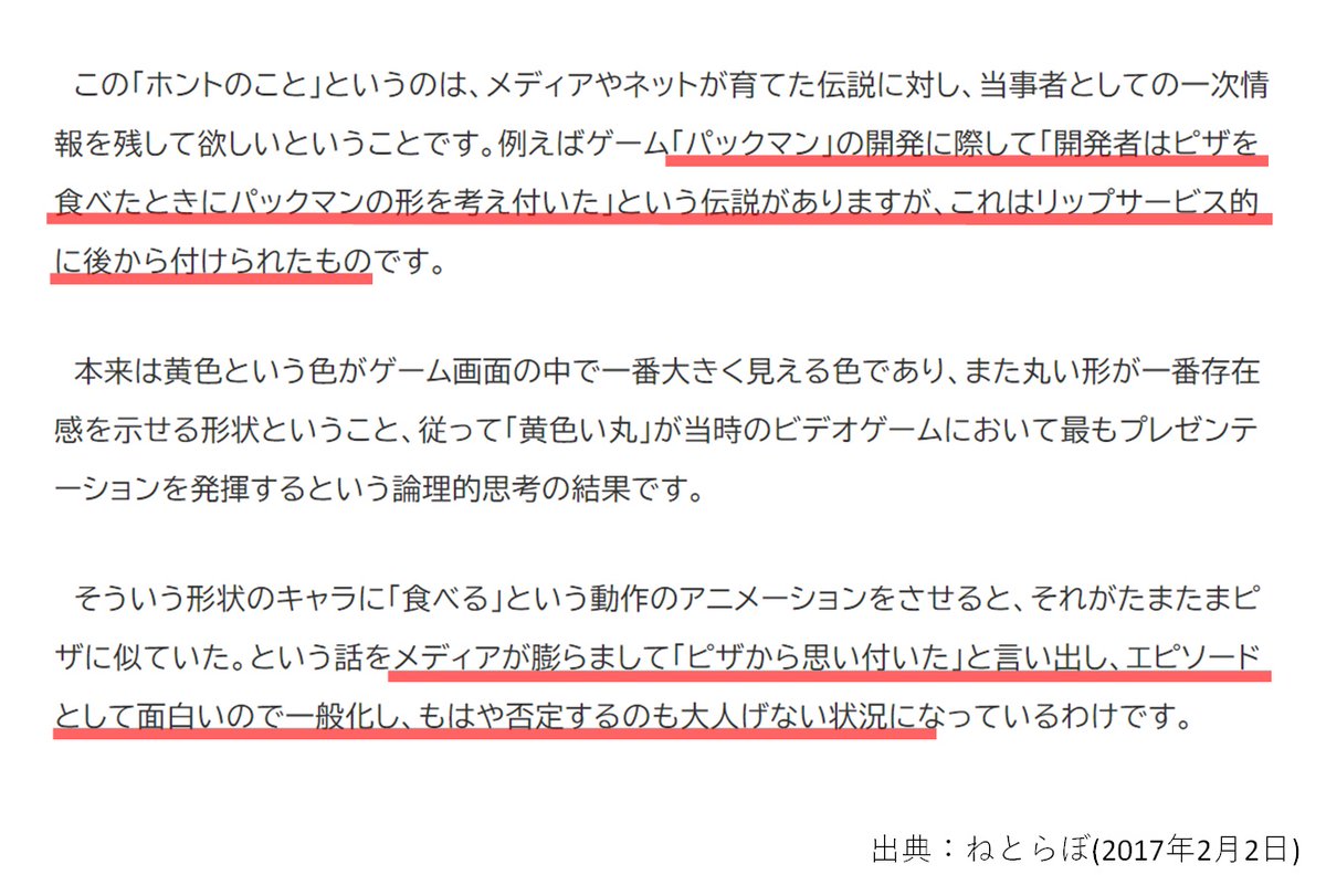 マリオの名前の由来となった倉庫オーナーは「実は似てなかった」とか、パックマンは食べかけのピザから着想を得たというのが「実は後付けのリップサービスだった」とか。ゲームにまつわる定番ネタが後年の関係者インタビューにてさらっと全否定されちゃう現象に名前を下さい。