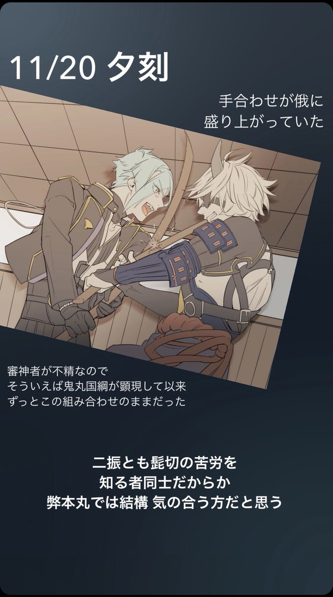 これは審神者の予告通り、もみあげリボン結びの刑に処されたイマジナリー白山吉光の図です。#白山吉光いません