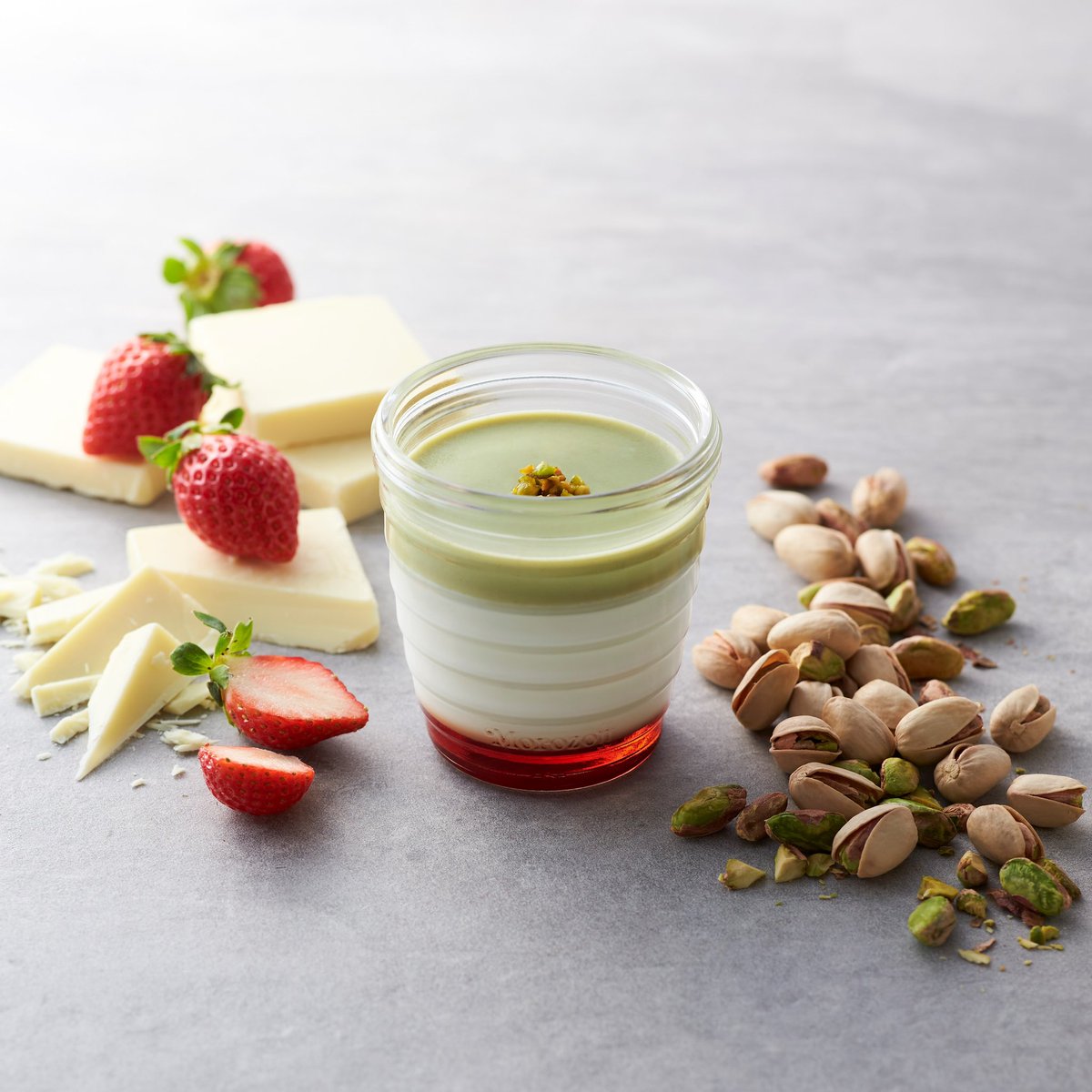 濃厚で香ばしいピスタチオのクリームと、まろやかな甘みのホワイトチョコレートプリンにすっきりとした甘さのストロベリーソースを合わせた、贅沢な3層仕立てのプリンです。