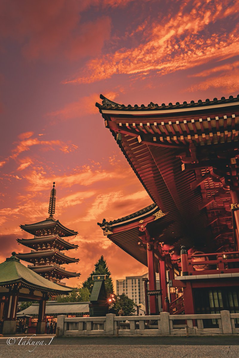 浅草寺と五重塔 燃えるような和の夕焼け