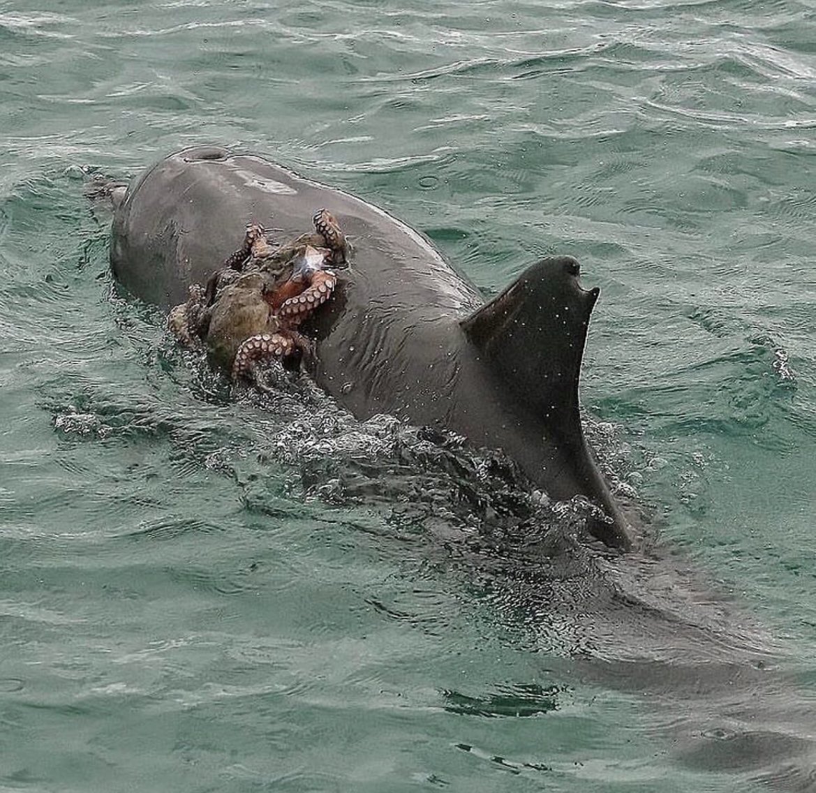イルカに掴まって移動するタコ
