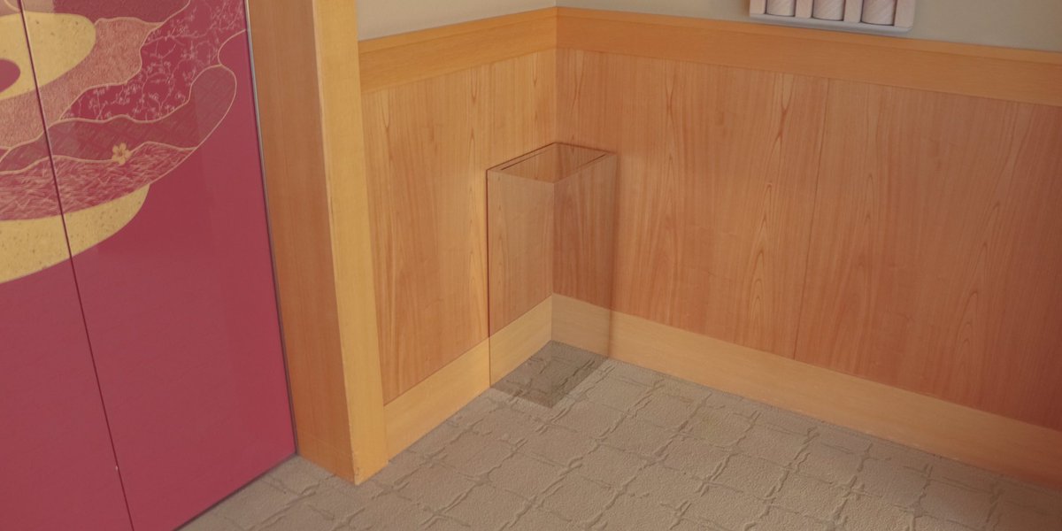 ホテルエレベーター脇のステンレス製ゴミ箱が擬態していた