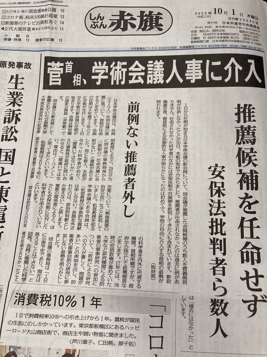 「しんぶん赤旗」がスクープした菅首相による日本学術会議の会員候補任命拒否の記事が、日本ジャーナリスト会議のJCJ賞を受賞しました。昨年は日曜版が「桜を見る会」で赤旗日曜版が大賞を受賞しています。2年連続の受賞は初めてです。