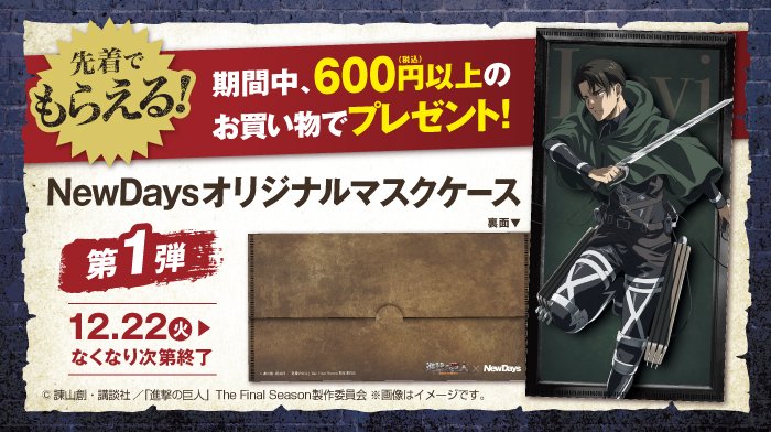 12/22(火)より、税込600円以上購入で進撃の巨人オリジナルマスクケースを先着でプレゼント✨