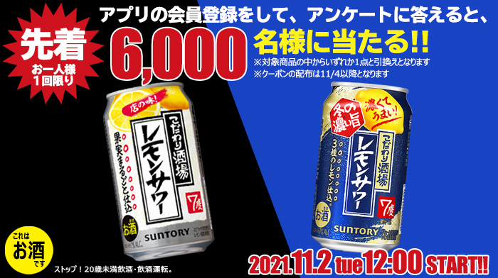アンケートに回答した先着6,000名様🔥に、対象のこだわり酒場レモンサワーいずれか1本無料クーポンプレゼント🎁