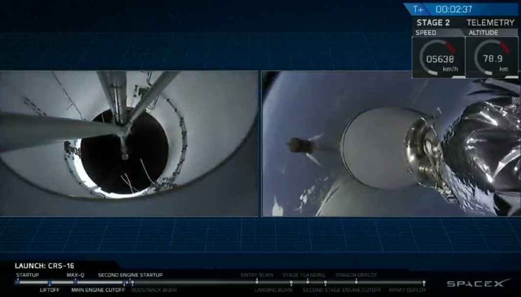 First stage entry burn complete. Second stage propelling Dragon into its orbit to meet up with the @Space_Station. spacex.com/webcast