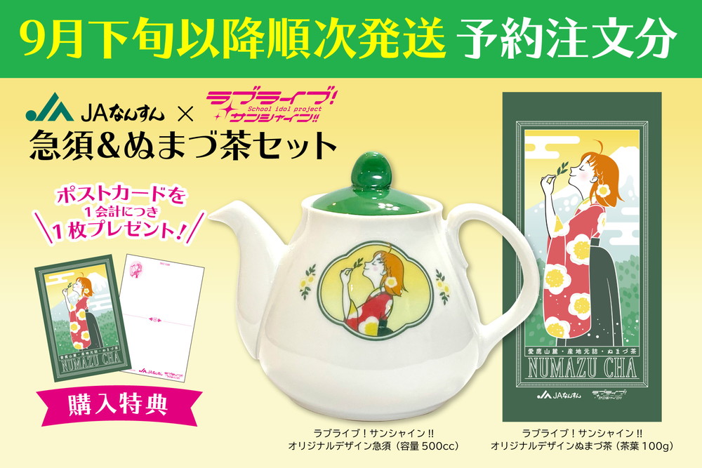 【沼津】JAなんすん『ラブライブ!サンシャイン!!』オリジナルデザインの急須&ぬまづ茶セットが早々に予定数に達してしまいましたため完売となっておりましたが、この度9月下旬以降発送分として追加予約を受け付けることとなりました。