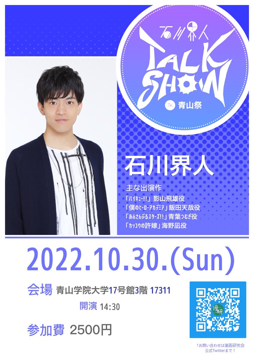こんにちは!青山学院大学漫画研究会です!青山祭2022での声優トークショーの開催が決定致しました!🎉