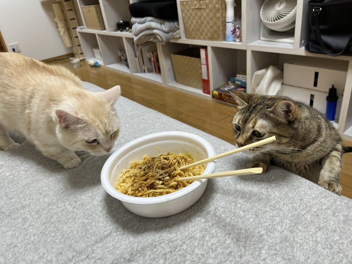 カップ麺の魚粉パウダーに色めき立つ猫ズ