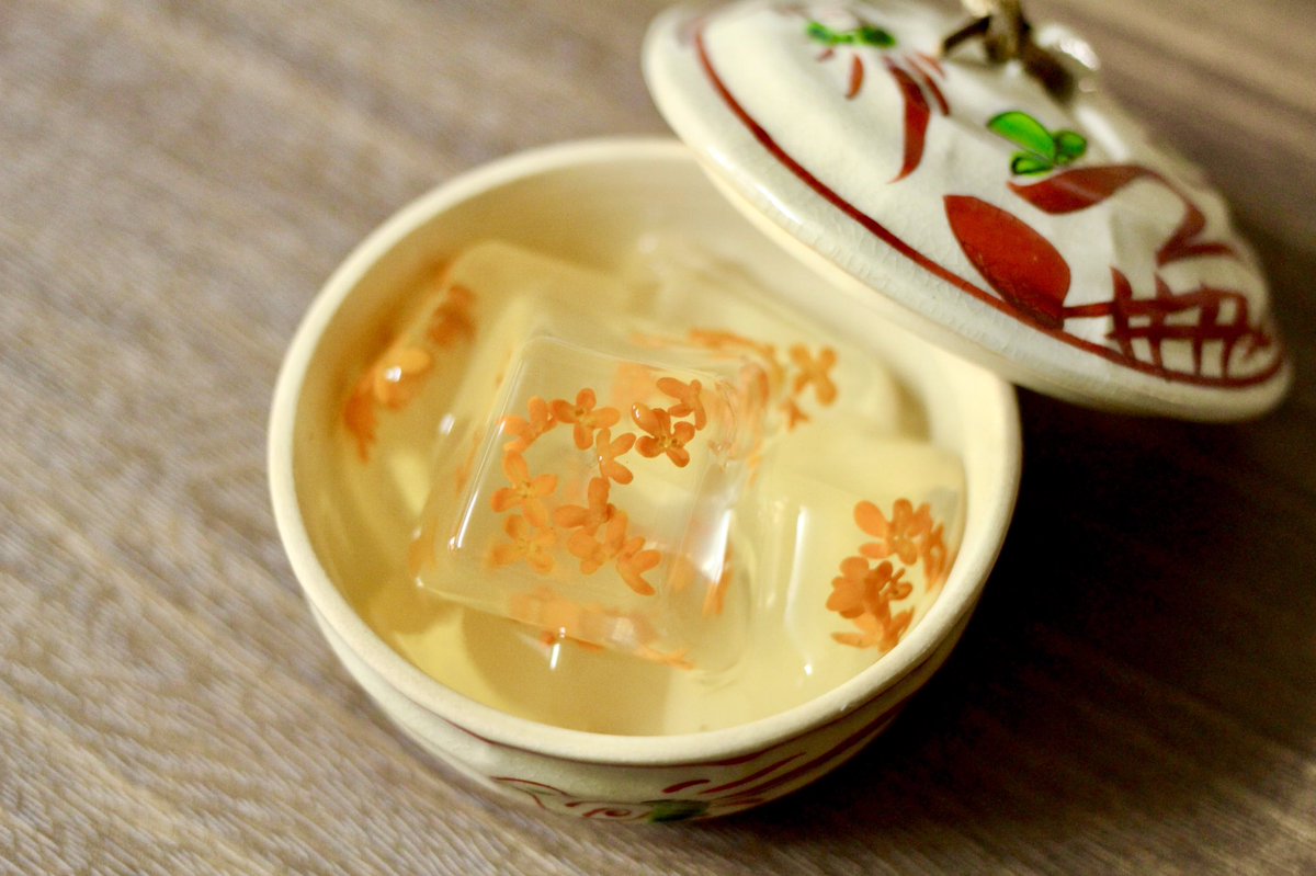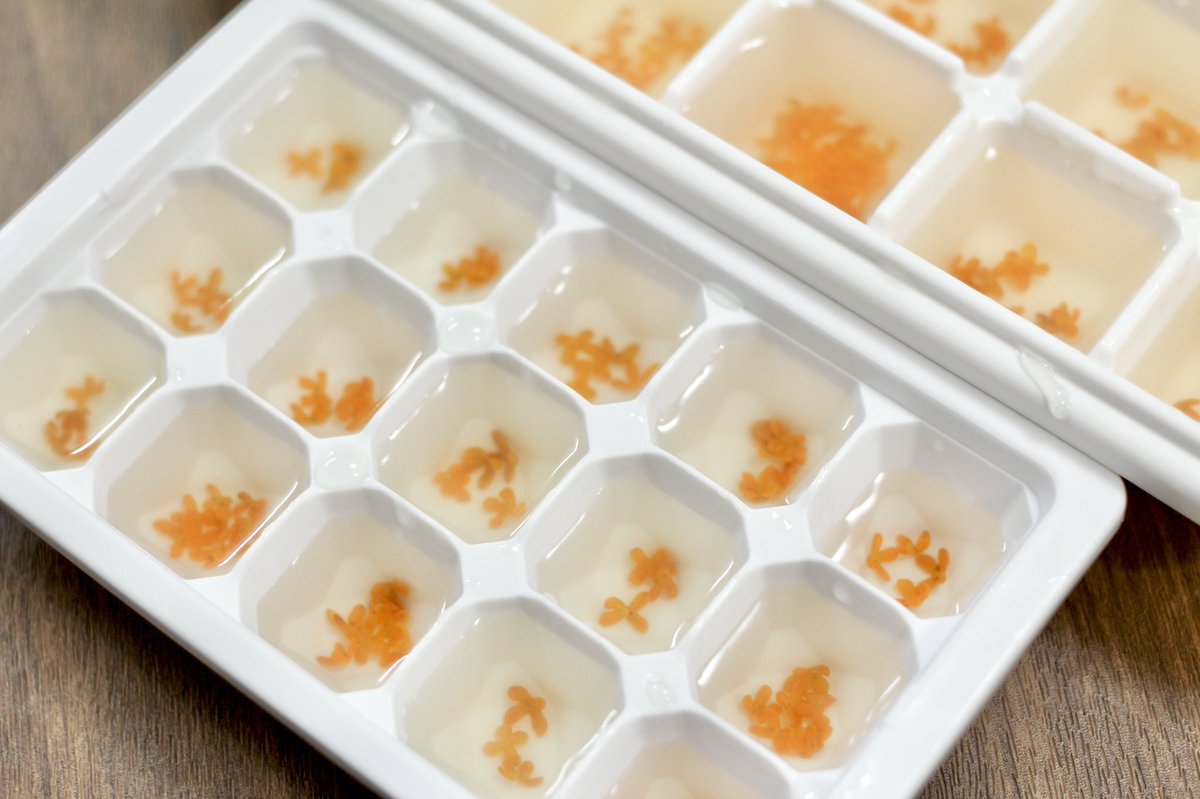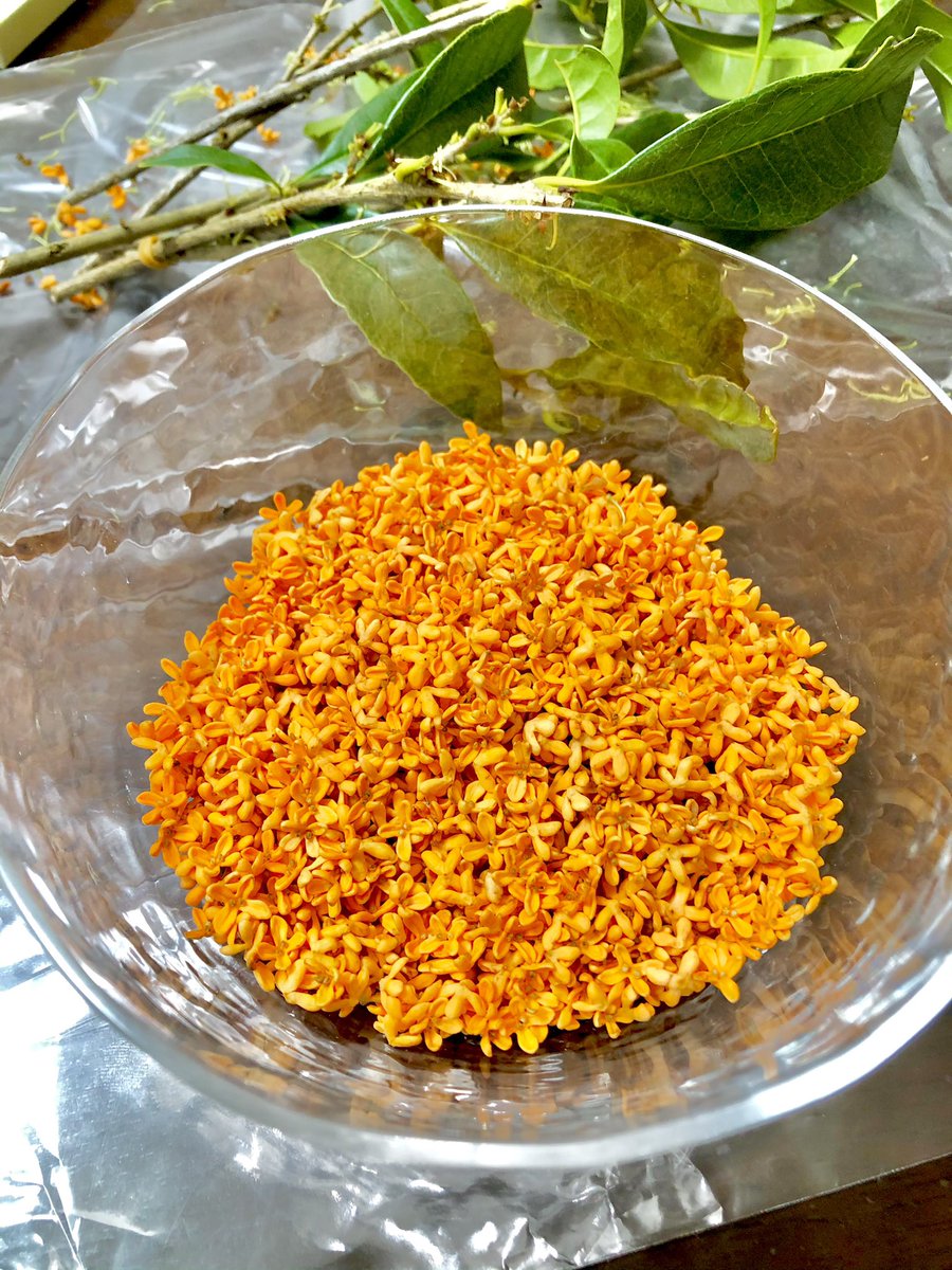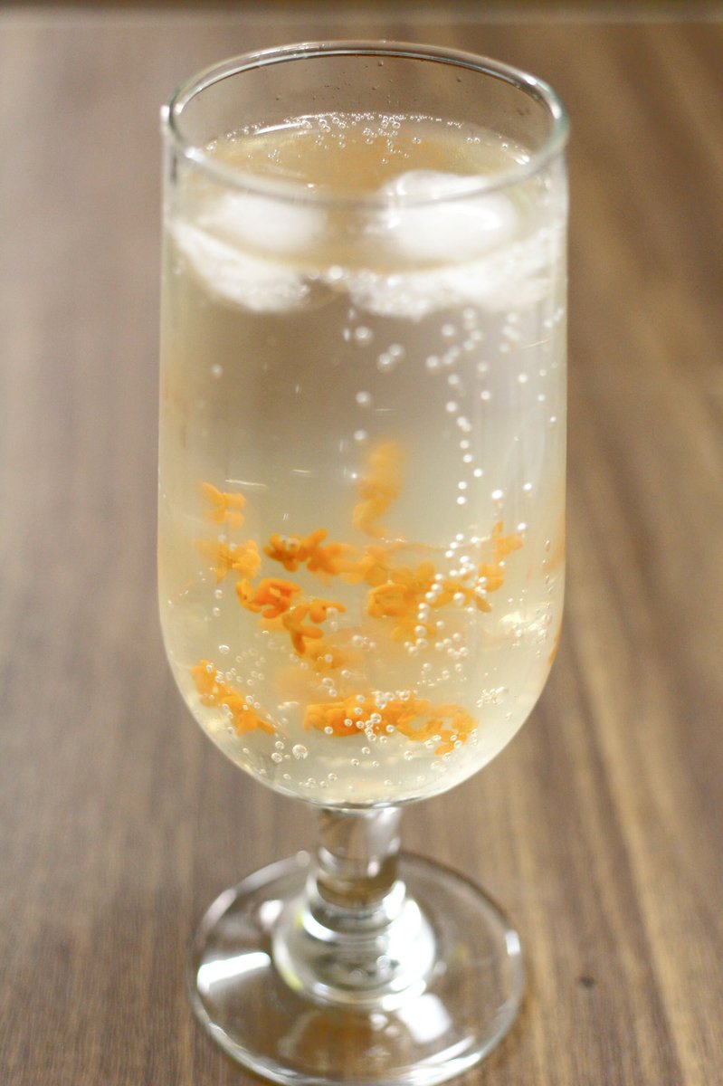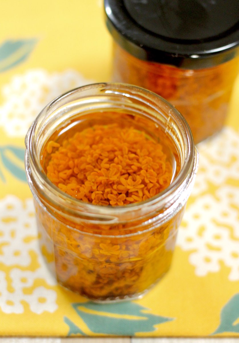 水200ccと砂糖100gを煮溶かし、水分が3分の2くらいになったら金木犀を投入