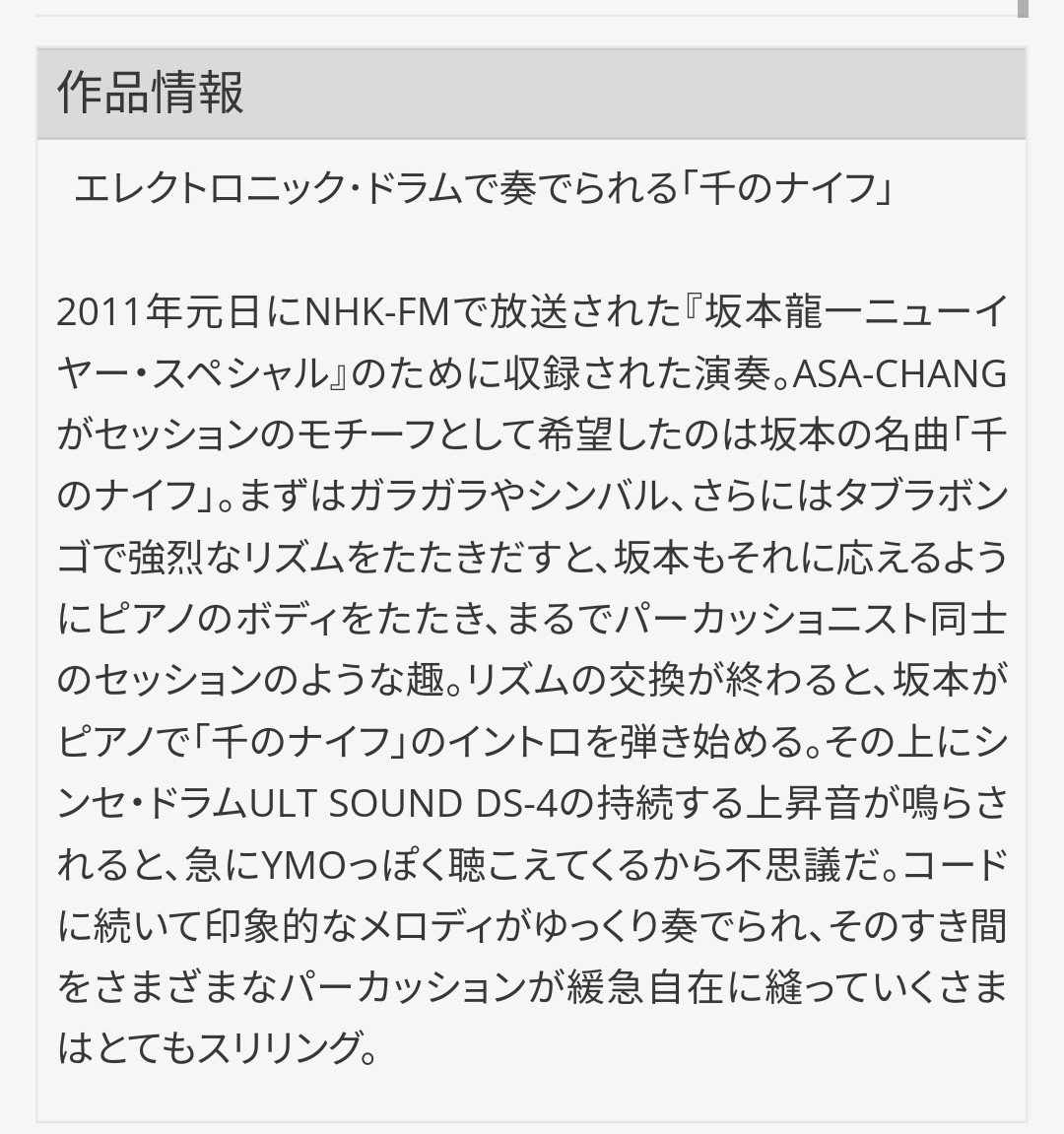 2011年元日にNHK-FM『坂本龍一 ニューイヤー・スペシャル』でオンエアされた音源が現在でも聴ける事を思い出している。