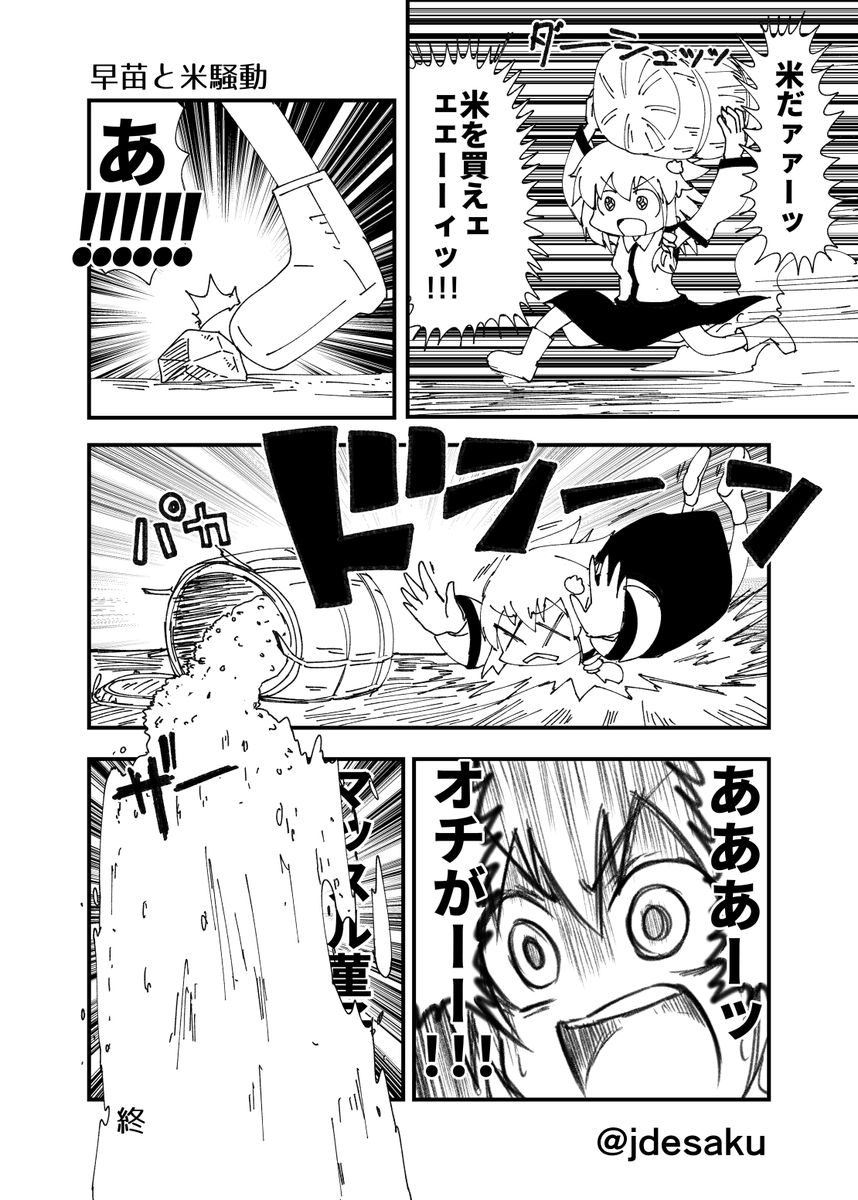 「マジで何も考えてない漫画」を描きたいと思い、タイトルを2秒で決めすぐにネームを5分以内で描くというルールで描いた漫画「早苗と米騒動」(東方)