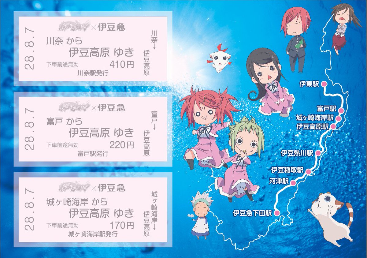 本日10日より伊豆急コラボ企画・記念乗車券が発売となりました!富戸・城ヶ崎海岸・伊豆高原・伊豆熱川・伊豆稲取・河津・伊豆急下田駅にて発売です!amanchu-anime.com/?p=244(宣伝ひげ) #あまんちゅ