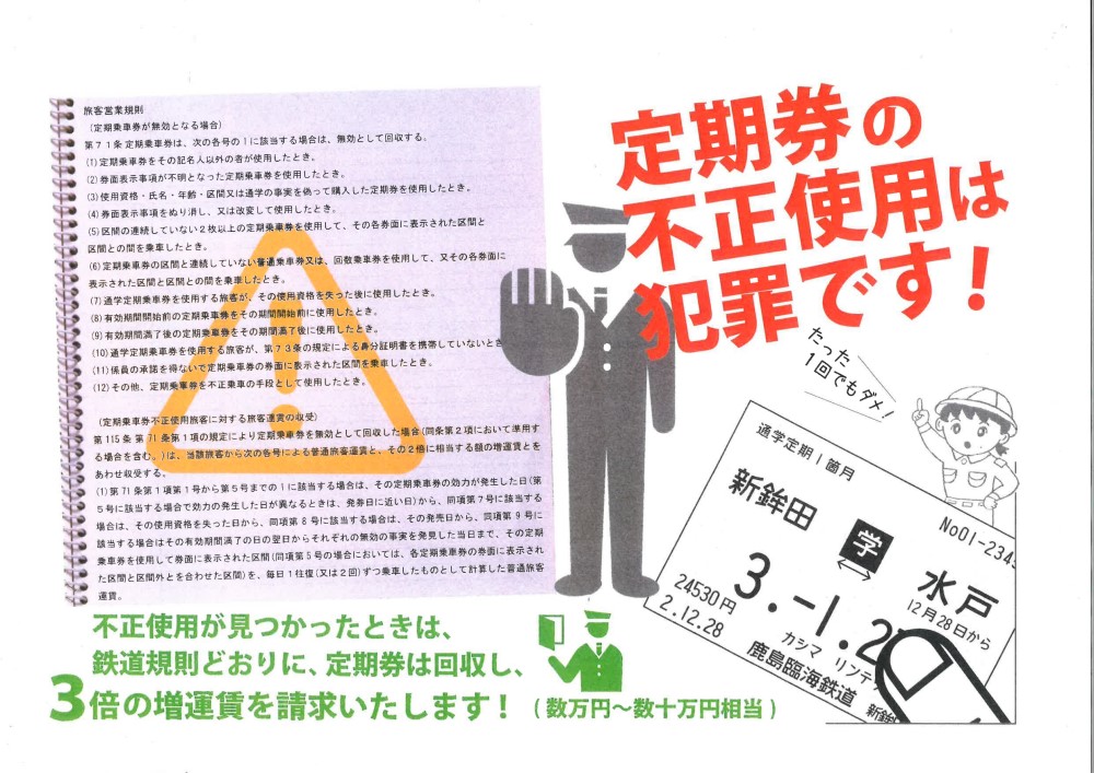 皆様からいただきます運賃は、鉄道を今後も運行していくために必要なものなのですが、定期券の不正使用、乗車区間を偽るなど不正乗車が後を絶ちません。