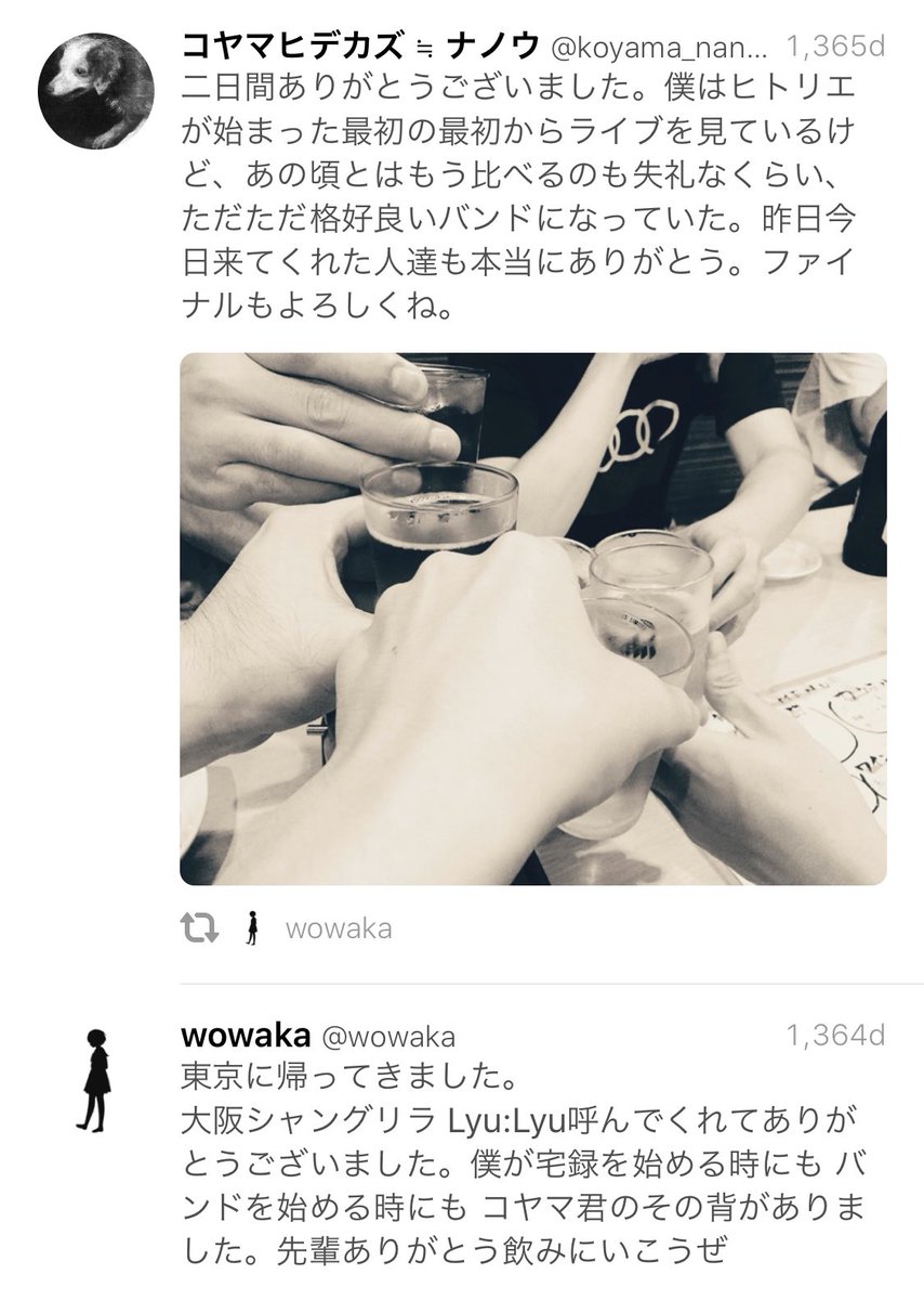 続)最近知ったばかりのものに対して仲間に入れない感を抱くのも分かる。だけど、僕らを新しく知る人がもっともっと沢山出てきてくれなきゃ僕らは困る。新しく好きになってくれた人達と前から好きだった人達、どちらか一方が肩身の狭い思いをするようなことが無ければいいなと思う。みんな大事。