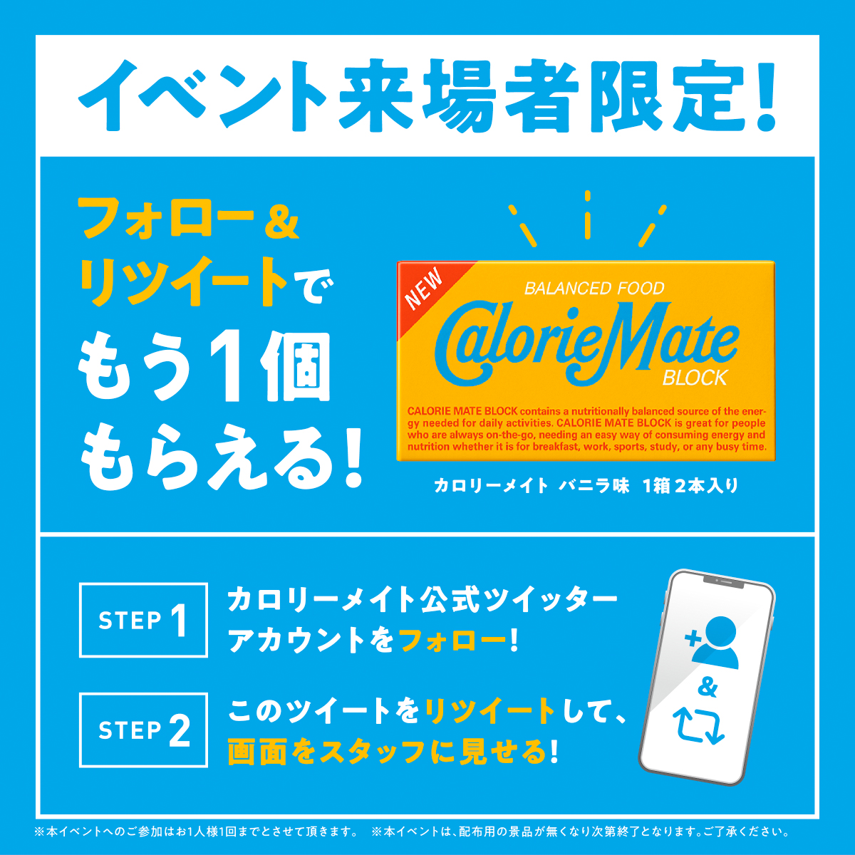 @CalorieMate_jpをフォロー&このツイートをRTして会場で提示すると、カロリーメイト新フレーバーの#バニラ味 をさらにもう一個プレゼント🟦