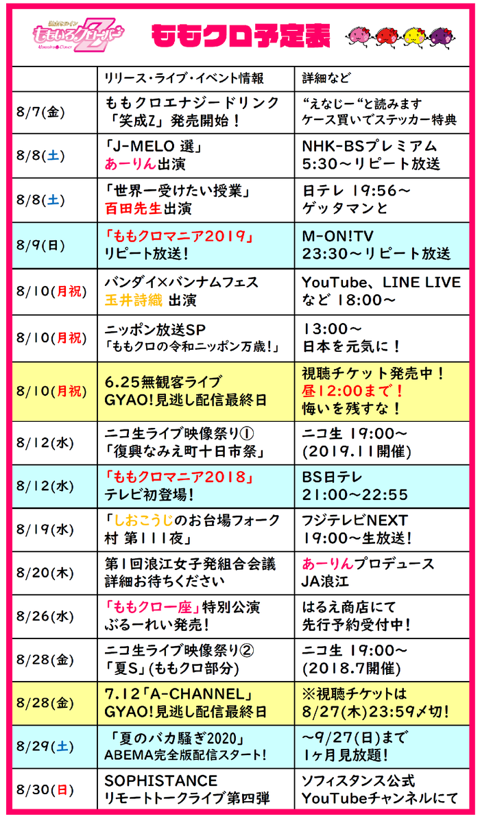 ももクロ予定表更新!