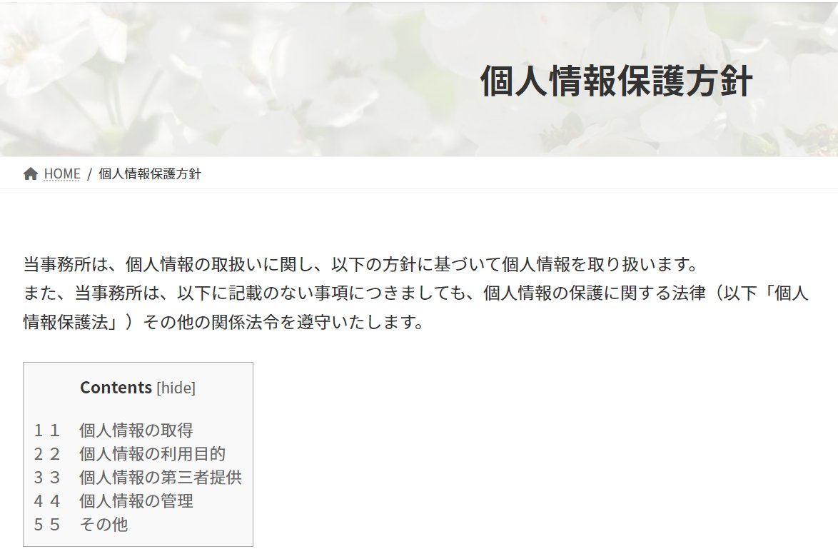 事務所のポリシーに、「個人情報の保護に関する法律(以下「個人情報保護法」)その他の関係法令を遵守いたします。」と書いてあれば、この法律事務所は個人情報保護法の適用をうける事業者で、事業者の義務を遵守するのだなと普通は考えますよね。