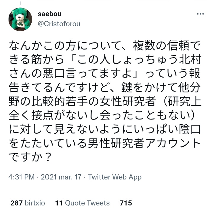 そういえば、さえぼう(北村紗衣准教授)は、私が間違いを指摘したら、家族が肝炎か何かになったことがあると関係ないことを言ってきたし、呉座先生にも、男女をまず強調していた。