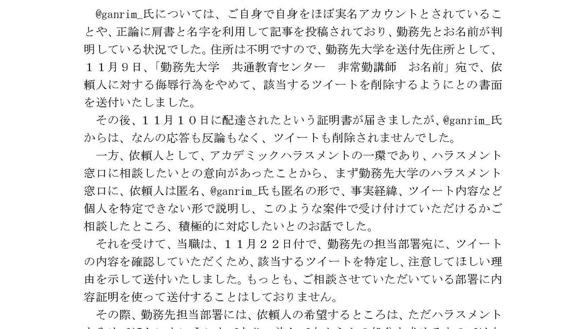 「アカデミックハラスメントの通報だから、大学宛てに送ってもいい」というのがさえぼう・さえぼう代理人の立場なんだけど、これってそもそもアカデミックハラスメントじゃないよねって思う。
