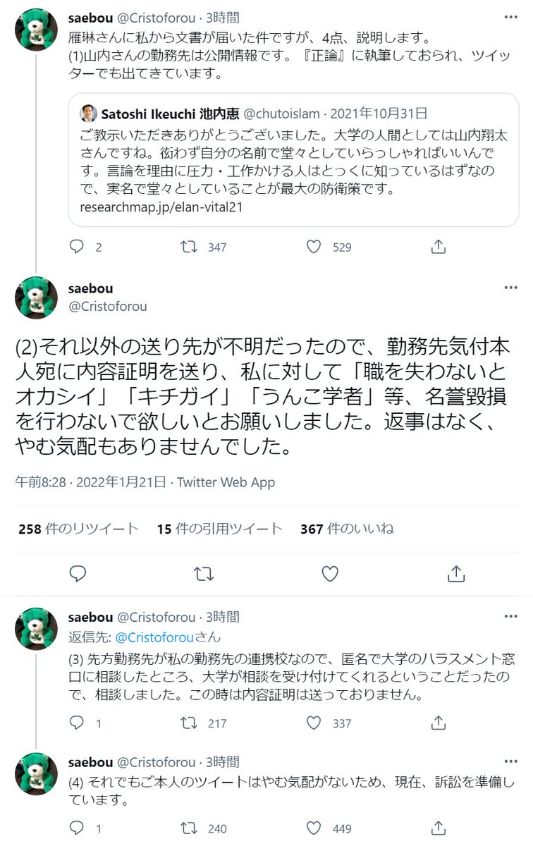 私がこの件について、看過できないと思ったのは、さえぼう代理人が名誉毀損・侮辱を主張していないからだ。