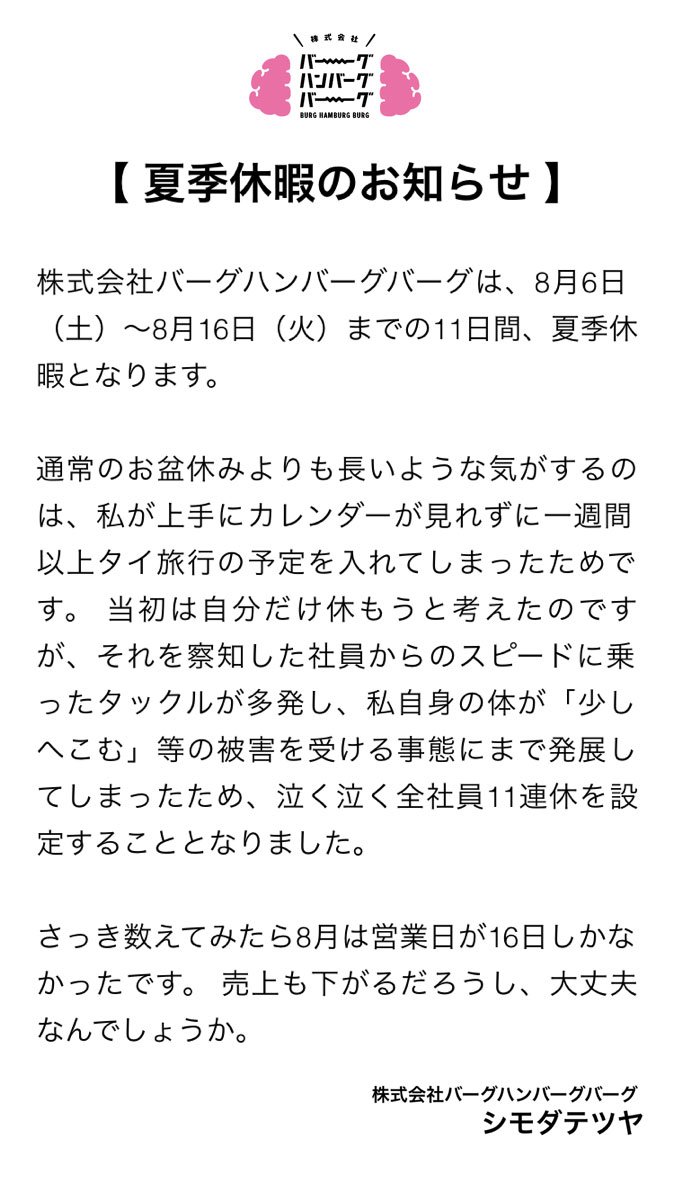バーグハンバーグのアシスタントをやってくれるアルバイトを募集したいと思ってます。都内在住で、特に資格はいりませんが最低限のPCスキルは持ってる方。10〜19時、週3日以上勤務できてバーグのこと知ってる方がいいなと思っております。応募頂いた方には200日以内に返信します。(続く)