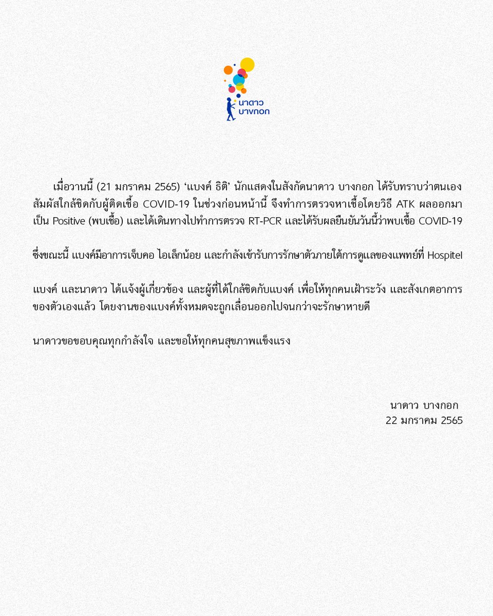 ประกาศสถานการณ์ COVID-19 : กรณี ‘แบงค์ ธิติ’ นักแสดงในสังกัดนาดาว บางกอก ตรวจพบเชื้อ COVID-19