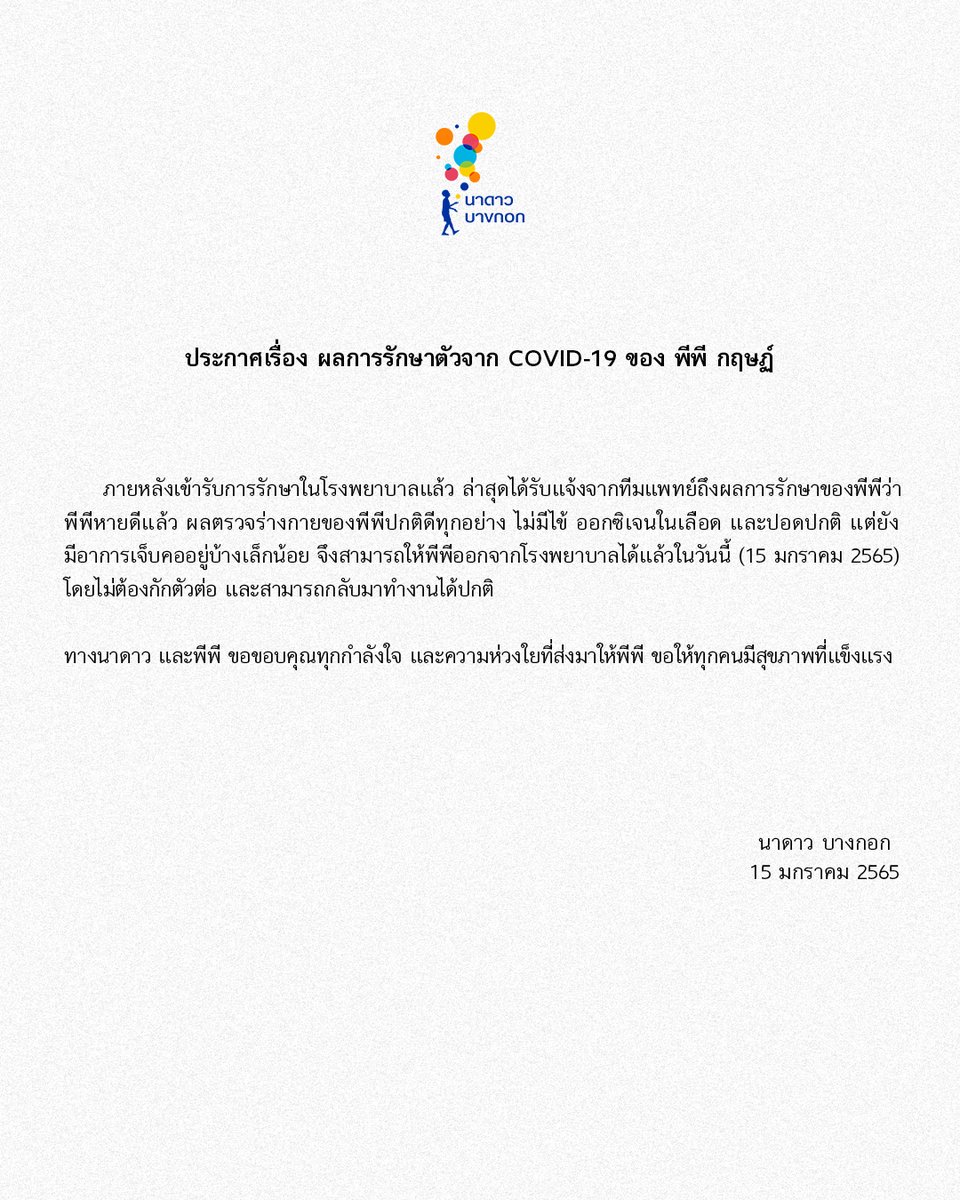 ประกาศเรื่องผลการรักษาตัวจาก COVID-19 ของ พีพี กฤษฏ์