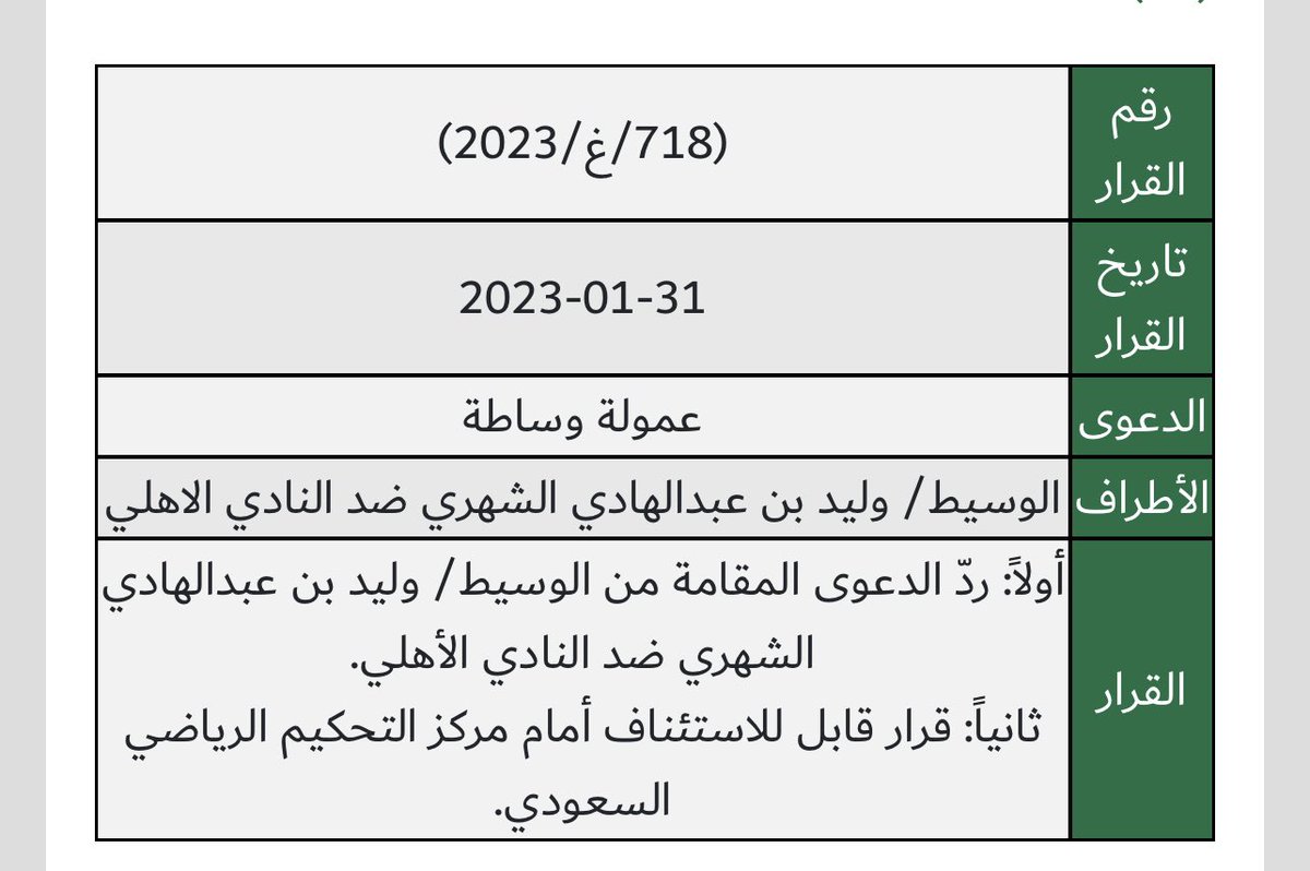 بأنَّ قرار مركز التحكيم بشأن قضيَّة #فهد_المولد تضمَّنَ أنَّه غير قابل للاستئناف😱😱