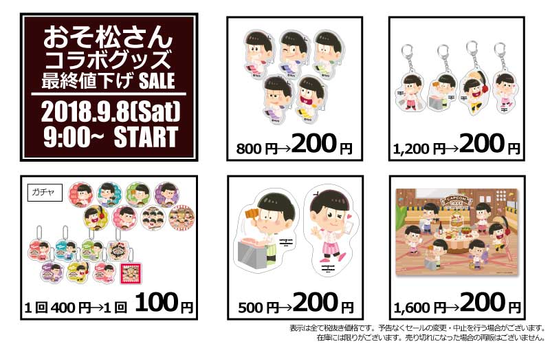 【SALE案内】2018年9月8日(土)より、「おそ松さん」コラボグッズの最終値下げSALEを開催します!最大87%OFF!!この機会をお見逃しなく♪さらに今回、ガチャ商品(全8種)が一度で全種揃うガチャコンプリートバージョン(税抜1,000円)の販売もございます!#おそ松さん