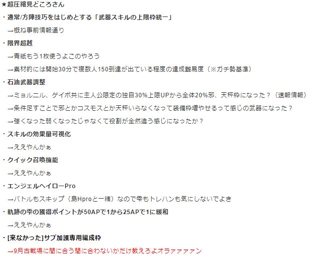 生放送で非常に多くの発表があり、9月中のスケジュールはほぼ出きっている状態です。