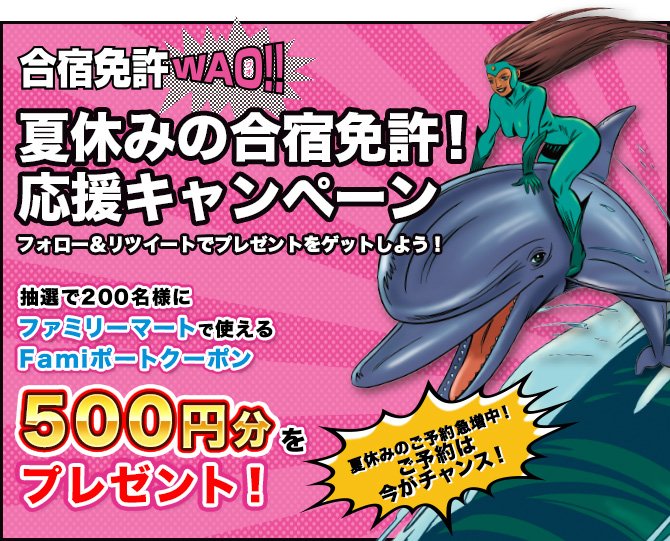 【夏休みの合宿免許!応援キャンペーン】免許を取るなら合宿免許WAO!!たった2週間だから、夏休みがチャンス!フォロー&リツイートで500円分のFamiポートクーポンプレゼント中!詳しくはmentoro.jp/event/event201…