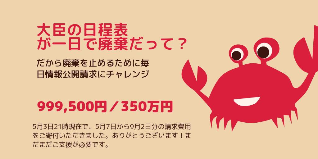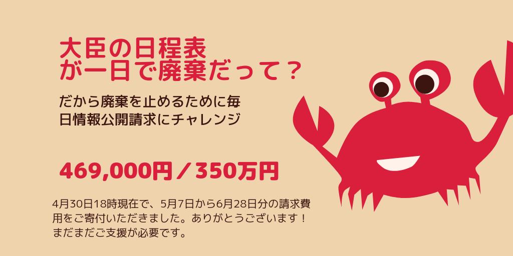 大臣日程表が即日廃棄。それを止めるために5月7日から平日毎日、情報公開請求をします。ただ、プロジェクト一年間まわすのには350万円必要。4月30日18時現在で6月28日までの請求費用が集まりました。まだご支援が必要です。よろしくお願いします。