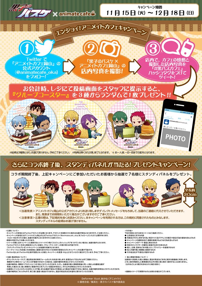 【アニメイトカフェ岡山】11/15(火)よりアニメイトカフェ岡山にてコラボカフェがスタート!期間中はグループコースターがもらえる「エンジョイ!アニメイトカフェキャンペーン」も実施です! tv.kurobas.com/news/2016/11/e… #kurobas