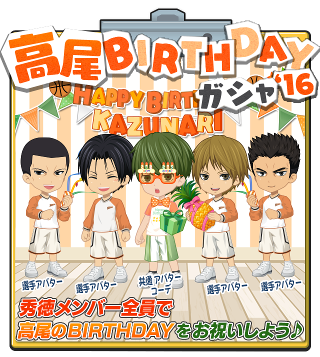 【黒バスアプリ】「高尾バースデイガシャ'16」開催中!選手アバターには秀徳メンバーが!さらに今回からはボイス付きアバターも登場です!bnent.jp/kurokotw #kurobas